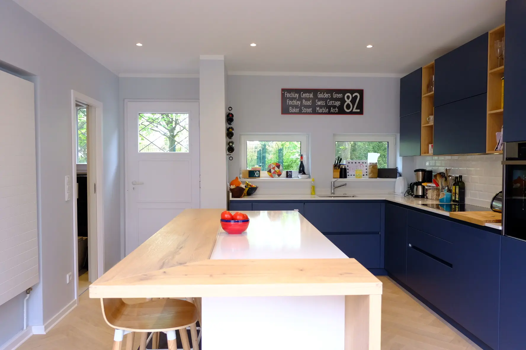 As part of the transformation, the former garage was integrated into the living area and reimagined as an open-plan kitchen. The new space establishes a direct connection with the dining area on the ground floor and extends outward to an outdoor deck, reinforcing the relationship between the interior and the garden.