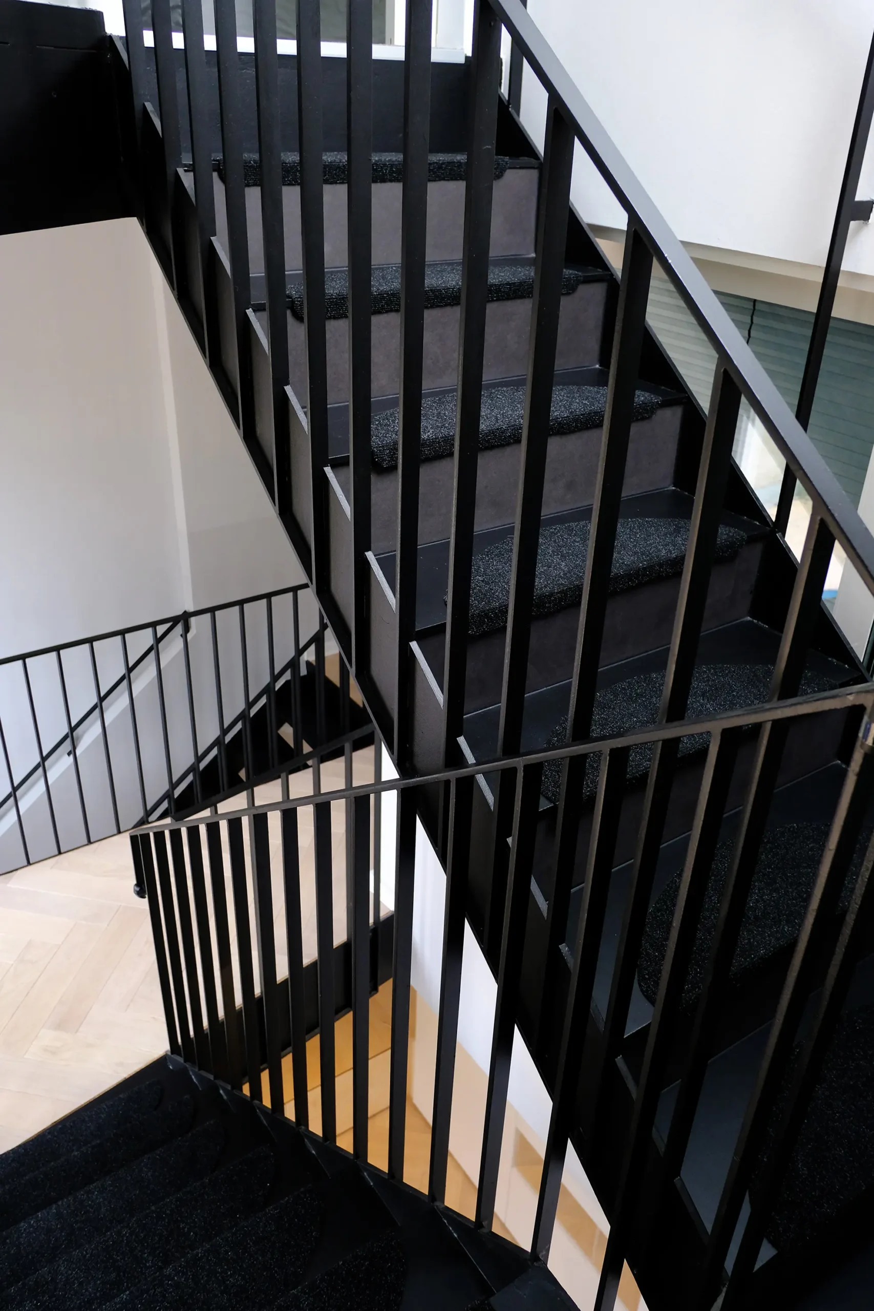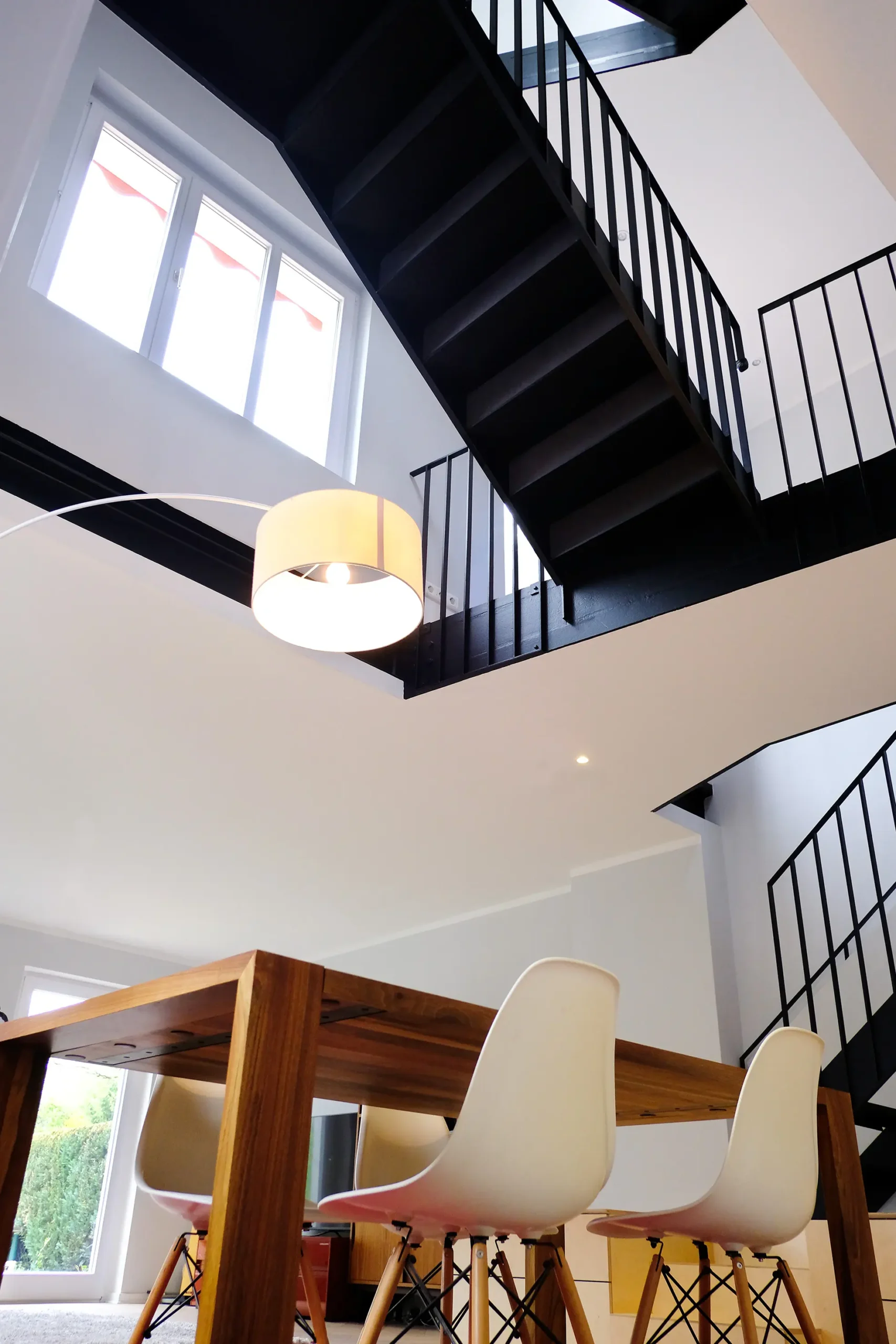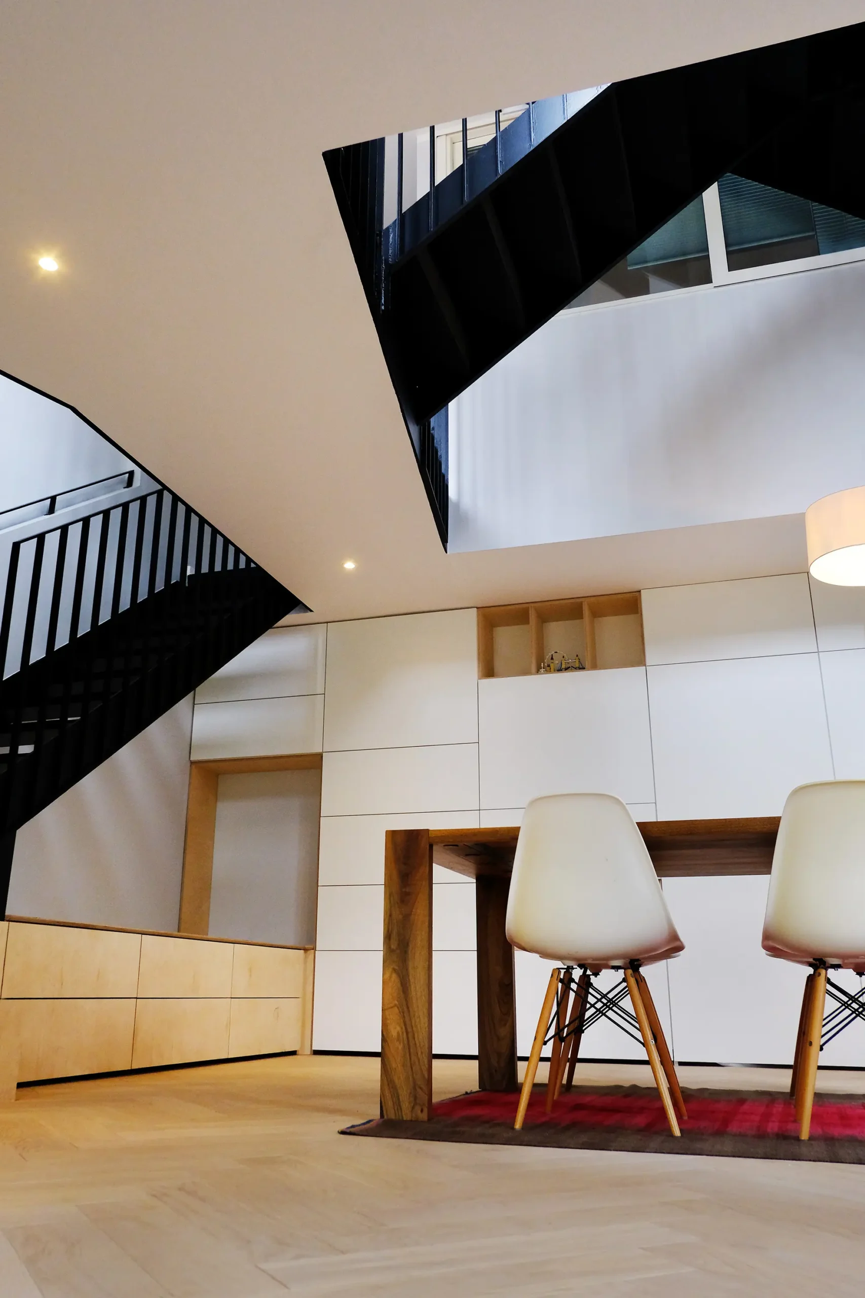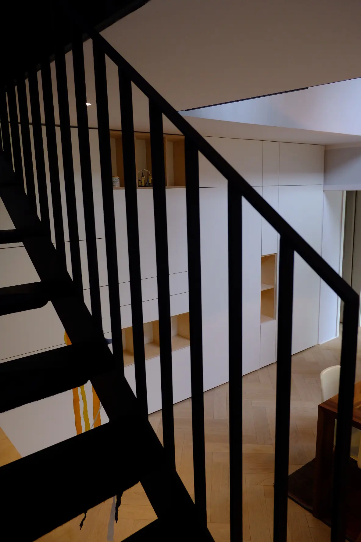 At the heart of the project lies the reconfiguration of the vertical circulation. Within a total area of approximately 170 sqm, the position and design of the staircases become the key element shaping the usability and perception of the interior spaces. Through a hybrid structure of steel and timber beams, portions of the slabs at the first and second floors were selectively opened, creating a full-height void that accommodates the new stair. This vertical space allows daylight to penetrate deep into the house, introducing a secondary and unexpected source of natural light that connects the levels and enhances the spatial continuity of the dwelling.